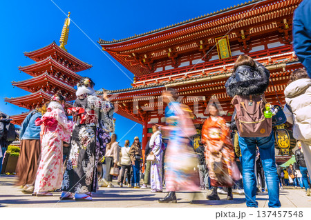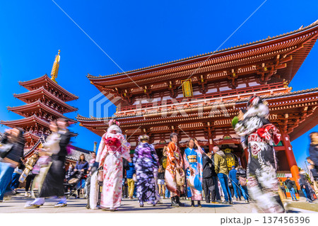 日本の東京都市景観インバウンドは続く…外国人観光客らで賑わう浅草寺。華やかな気分に…=3月8日