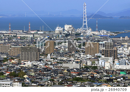 西条市の中心部と臨海工業地帯を俯瞰する。燧灘を挟んで来島海峡大橋が見える。