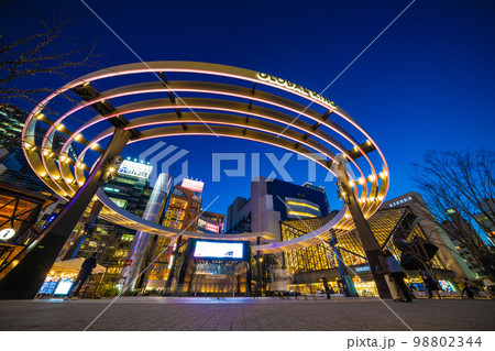 日本の東京都市景観 2月・池袋駅前の池袋西口公園・“虹色”に輝くグローバルリングなどを望む=2月1日