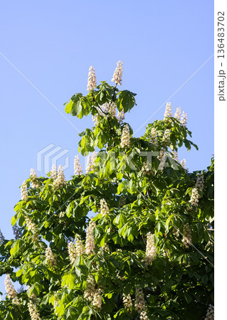 Close-up White chestnut flowers with green leaves. Aesculus Hippocastanum flowering of a horse chestnut in a park in cologne in spring.