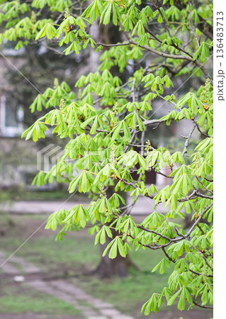 A horse chestnut tree with fresh green foliage. Elegance and botanical details.
