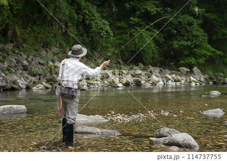 初夏の渓流で釣りをする男性