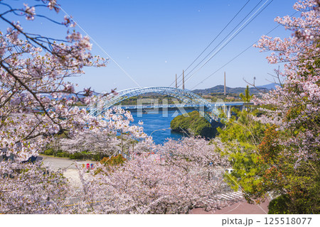 桜に囲まれた新西海橋と青空の春風景
