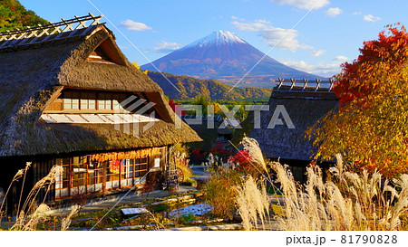 秋の西湖いやしの里根場 ススキと茅葺き屋根越しに望む冠雪富士