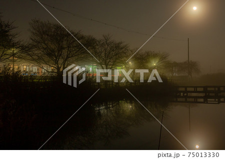 霧の中の満月と水面