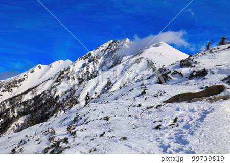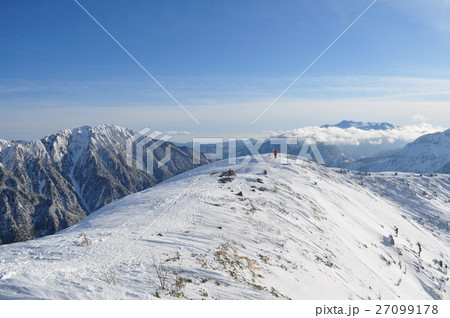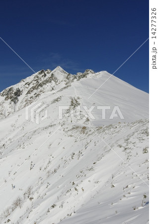 西穂丸山から西穂高岳主峰へ続く冠雪の稜線