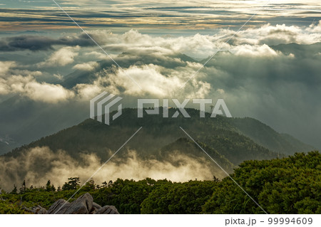北アルプス・西穂高岳稜線から見る夕日差す山並みと雲海