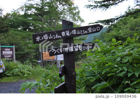 高峰高原 高峰温泉~前の水ノ塔山 東篭ノ塔山登山口、うぐいす展望台を示す行先案内板