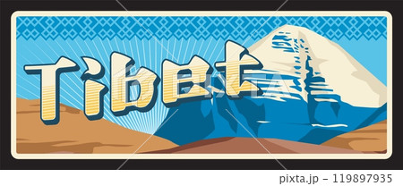 Tibet Autonomous Region of China, mountain area landscape with summit and snow on peak. Vector travel plate, vintage sign, retro postcard design. Old plaque with nature and wilderness