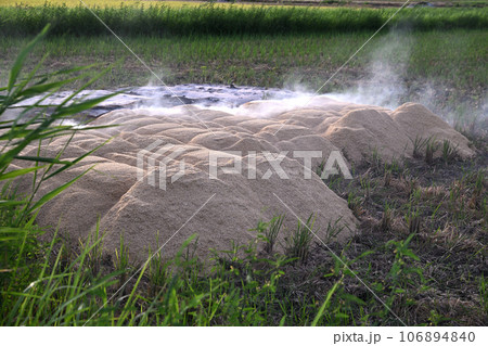 もみ殻白煙 収穫時期 秋の風景 荒川河川敷
