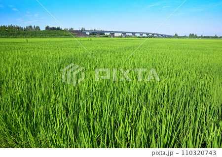 夏の田園風景 稲の成長 荒川河川敷 さいたま市