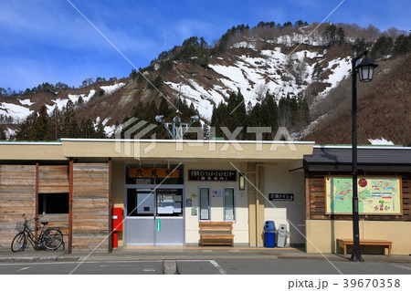 屋根に雪が積もった只見駅と要害山 福島県只見町