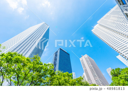 looking up view of city skyline in tokyo, japan
