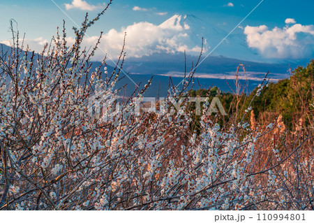 (静岡県)満開の白梅の向こうに、雲で見え隠れする富士山 夕景