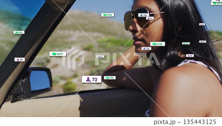 Gazing ahead Indian woman wearing aviator sunglasses in convertible on rural road, copy space