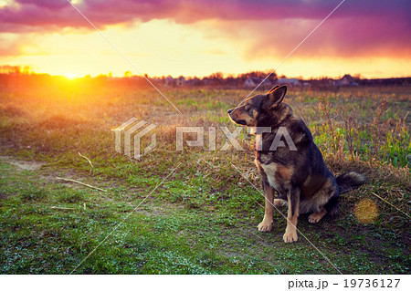 Dog gazing sunset in countryside