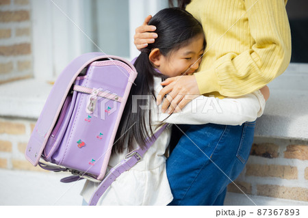 出勤する父親と一緒に登校する小学生の娘