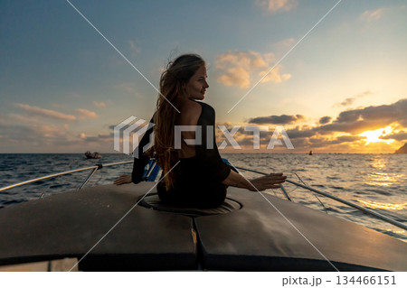 Woman, boat, sunset. Beautiful woman sitting on luxurious boat enjoying tranquil evening at sea during golden hour.