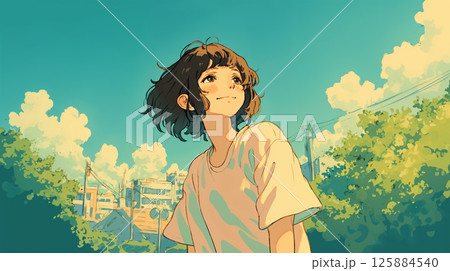都会で青空を見上げる制服の男子学生または社会人の横顔左向きアニメ風イラスト、左に余白