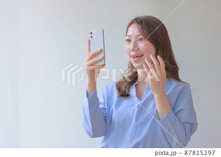 スマホを見て喜ぶビジネスウーマン_右手に動き有1