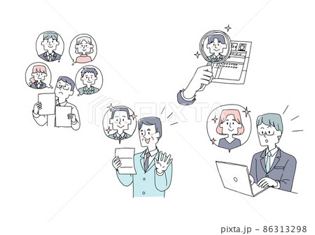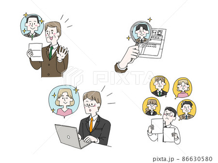 インターネットで良い転職希望者を見つけた人事担当 コミカルな手書きの人物