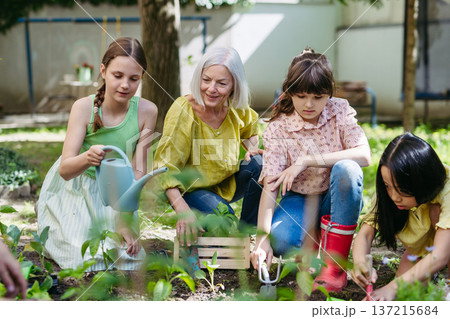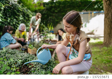 Young kids taking care of plants in school garden during at outdoor sustainable education class, planting flowers, herbs and vegetables. Concept of experiential learning and ecoliteracy.