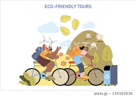Vector illustration of two people on bicycles exploring nature. They admire the scenery, including wind turbines and sheep, promoting eco-friendly travel. Leaves and a recycling bin signify