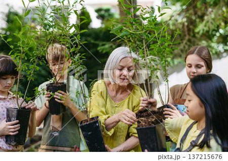 Teacher showing young students how to plant vegetable seedlings during outdoor sustainable education, lesson in forest school. Concept of experiential learning and ecoliteracy.