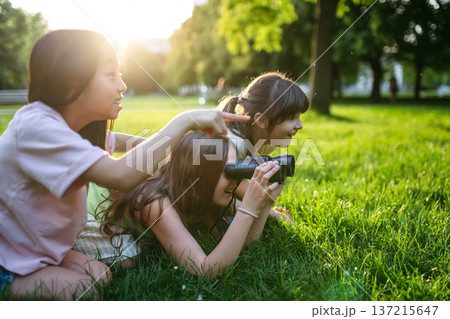 Young girl students learning about nature and wildlife in urban environment, using binoculars and observing animals in public park.