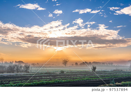 「見沼田んぼ」冬の朝 朝霧の立ち込める美しい風景