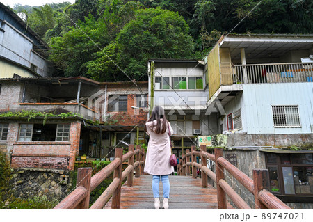 台灣台北市新北市石碇村著名的石碇老街,女孩背景