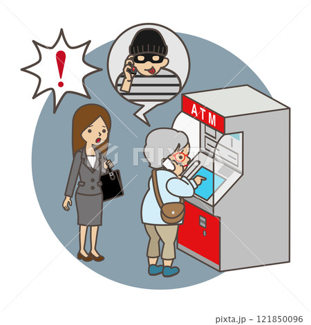 ATMを操作する高齢者を見て詐欺に気づくスーツを着た女性 主線あり