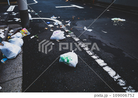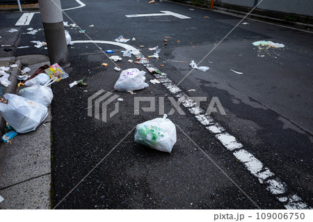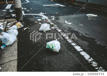 路上にゴミが散乱する街角 高彩度マット感