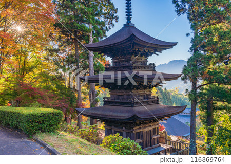 秋の信州青木村 紅葉の大法寺 国宝三重塔