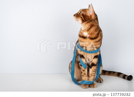 Bengal cat with measuring tape looking away