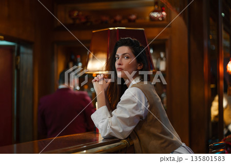 Stylish woman leaning on bar counter in dim lounge