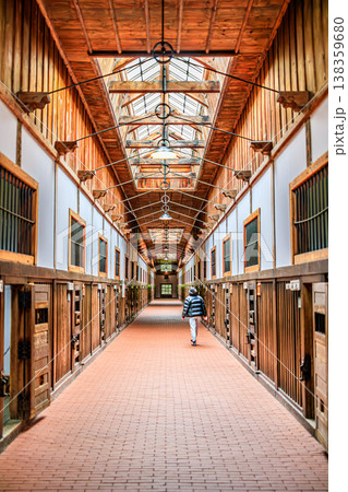 伝統的な木造施設の長い廊下と幾何学的な天井構造