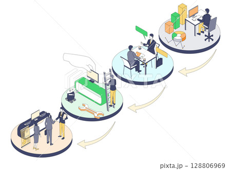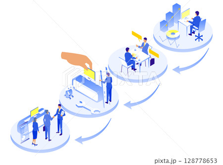 ステップで理解する業務プロセス|ビジネスの流れを視覚化したアイソメイラスト