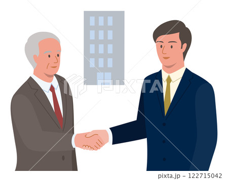 スーツ姿の高齢者・シニアと若者(M&A・後継者・事業継承・跡取り・売却・買収・世代交代)