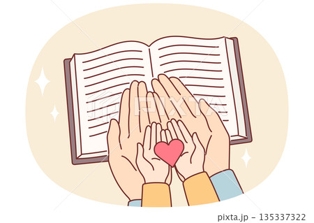 Hands of child and mother over bible with christian prayers, as metaphor for religious education