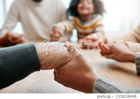 Family prayer, holding hands and dinner buffet at home of grandparents with children at a table. Worship, praying and food for a holiday together in a house with spiritual gratitude for feast