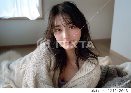 柔らかな朝光に包まれる穏やかな目覚めのアジア人女性