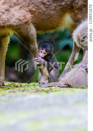 ヤクザルの子ども ヤクシカの足をつかむ 世界自然遺産屋久島(春