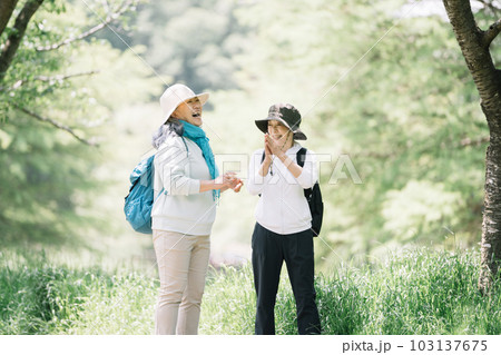 ハイキングを楽しむシニア女性友達