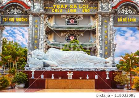 statue of white reclining Buddha at the Buddhist pagoda Thap Xa Loi in Da Nang in Vietnam in Asia