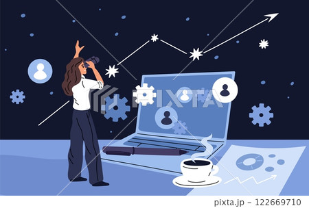 Woman looks through binoculars. Search for startups goals and development prospects. Telescope stars watching. Business growth opportunity finding. Project diagram. Garish vector concept