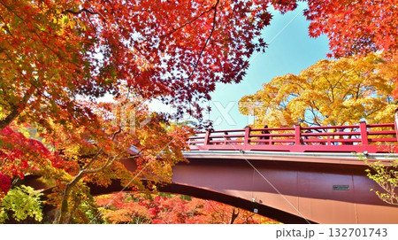 紅葉の新潟県西蒲原郡弥彦村弥彦公園もみじ谷観月橋風景