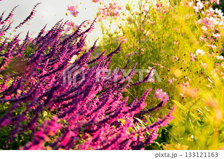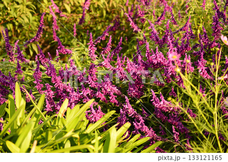 朝日を浴びて輝くアメジストセージ