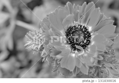 モノクロな花のアップ 八重咲きのアネモネ