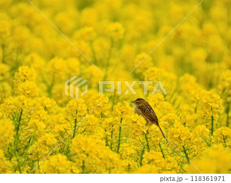 一面黄色の菜の花畑と花にとまる野鳥セッカ